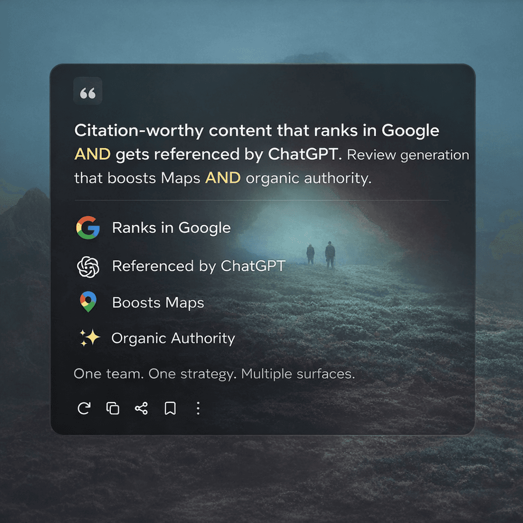 Citation-worthy content that ranks in Google AND gets referenced by ChatGPT. Review generation that boosts Maps AND organic authority. One team. One strategy. Multiple surfaces.