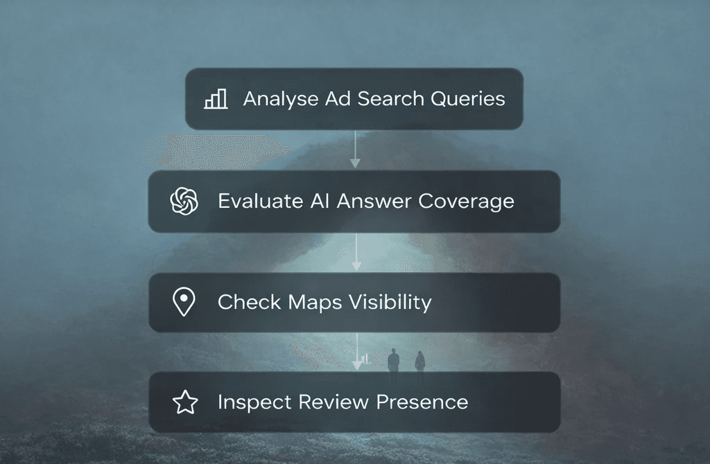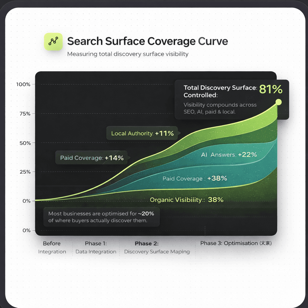 We analyse Google Ads search queries, AI answer coverage, Maps visibility, and review presence. Most businesses discover they're only optimised for 20% of their discovery surface. We show you where you're invisible — then fix it.