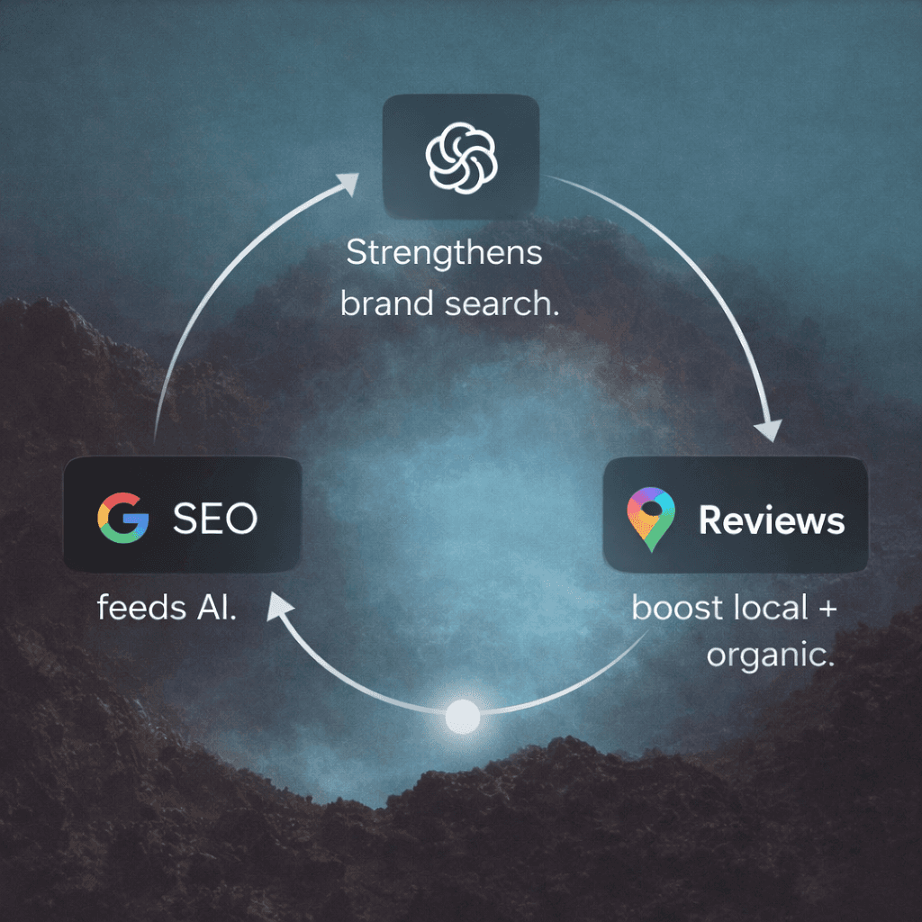 SEO feeds AI. AI strengthens brand search. Reviews boost local + organic. Authority in one area multiplies across others. Early adopters compound faster.